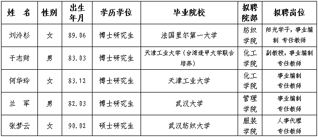 根據(jù)《武漢紡織大學人才招聘實施辦法》和省人社廳批復的《武漢紡織大學2017年專項公開招聘工作方案》相關規(guī)定要求,經學校人才辦初審,相關二級院部復審和面試考核,學校學術委員會、教師審議小組審議,學校2017年第14次校長辦公會會議審定,現(xiàn)將擬聘人員名單予以公示: