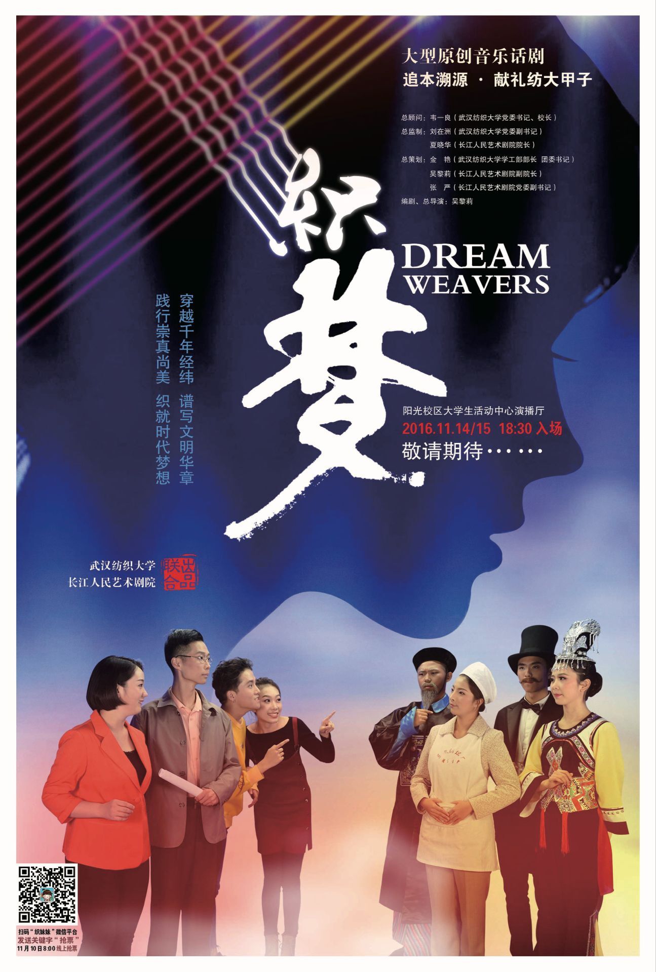 為獻禮紡大甲子,由我校與長江人民藝術(shù)劇院聯(lián)合創(chuàng)作的大型原創(chuàng)音樂話劇《織夢》將于2016年11月14、15日晚在陽光校區(qū)大活演播廳盛大首演,歡迎廣大師生前往觀看。